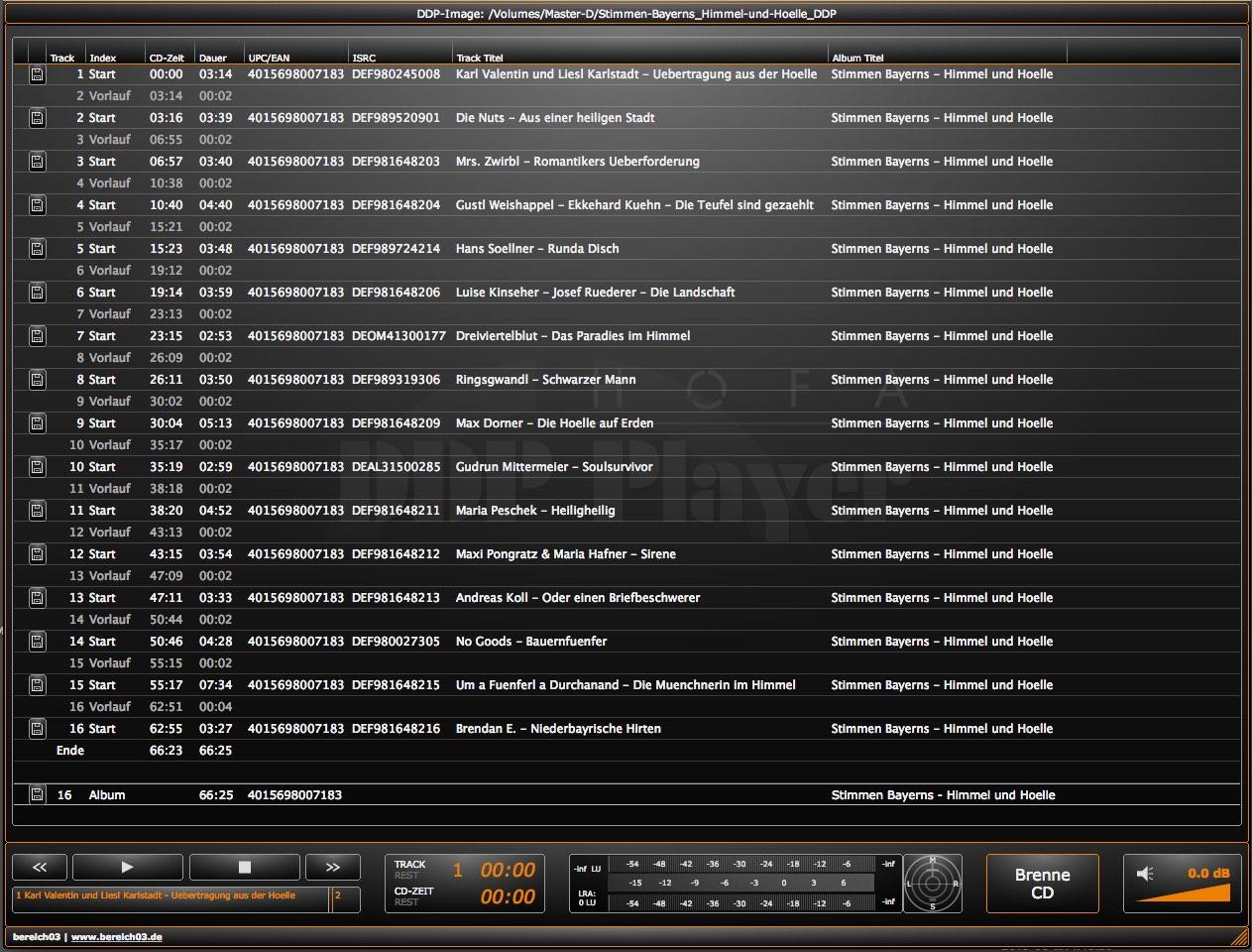 Damit können Sie zur Kontrolle die komplette CD durchhören, alle Titel und Namen kontrolliern, alle ISRC Codes und den EAN Code kontrollieren und auch eine CD brennen.